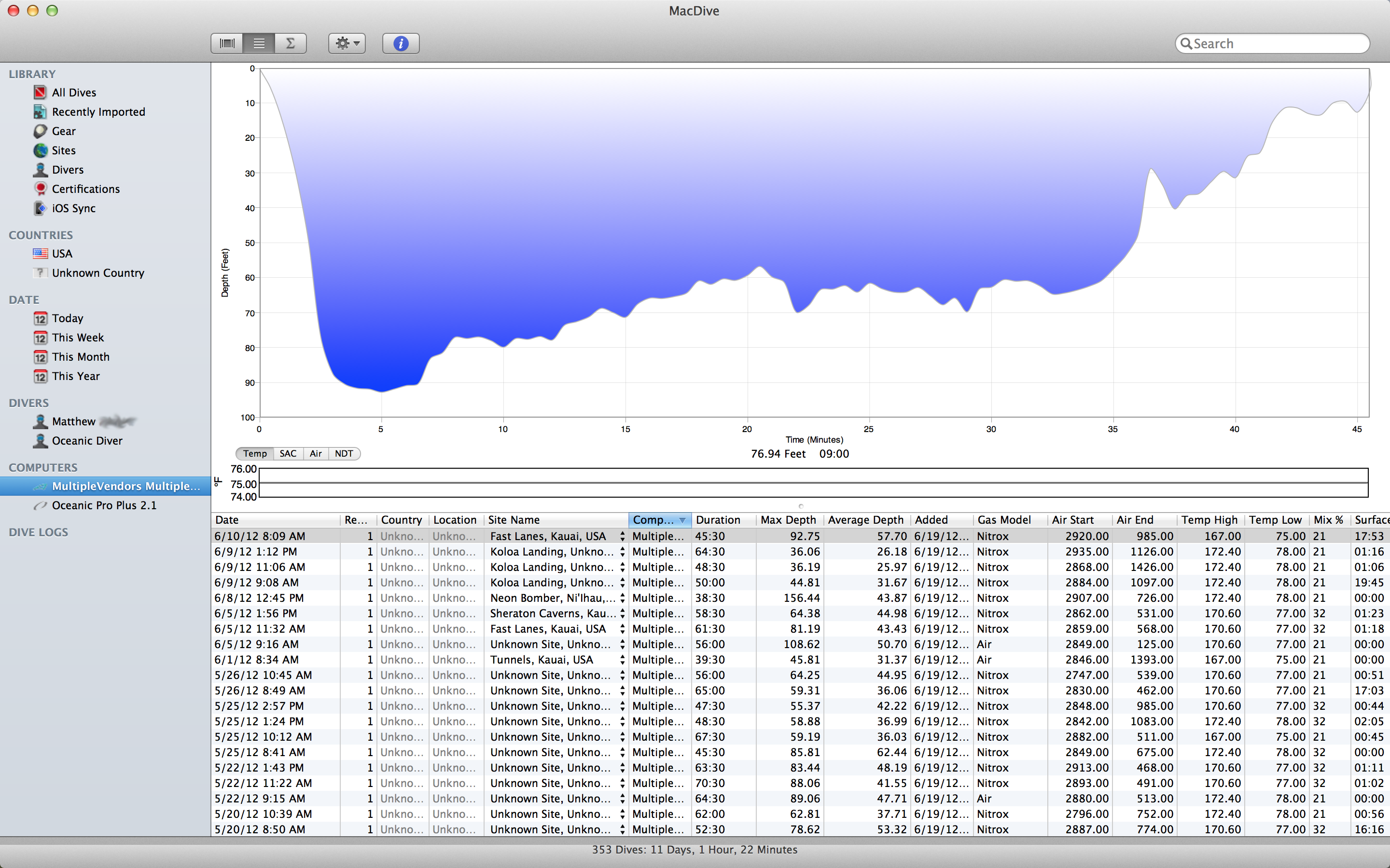 I'm having an issue where once I did a swap over to my MBP w/ Retina I noticed that it split all of my dives into two columns from there on out. Whenever I download new dives they all come in under "Oceanic Diver" instead of being under my name, like my first 350 something dives imported. I've only used this one dive computer with the program so why does it have another labeled as "MultipleVendors Multiple Devices" and why can't I delete that out of the Gear Box and have all dives selected and merged to 1 computer? 1 diver...?