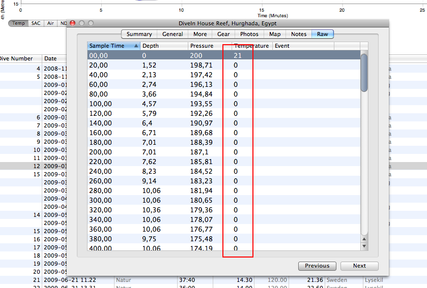 Regarding temperature the data is registred in my computer (Suunto D4) and can be seen when viewed on the computer but for some reason some parts of the data for some dives are not transmitted to Mac Dive.