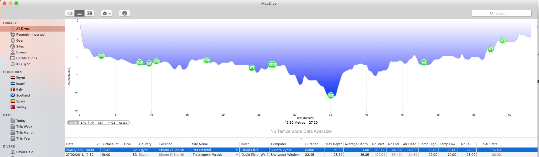 Attached is what the log looks like. I have about 190 photos attached to various dives
