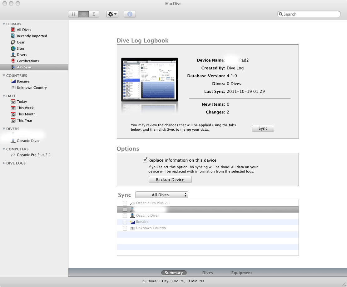 I did that but it doesn't work. I enabled sync'ing on iO/S DiveLog. I click iO/S Sync in MacDive. I have 25 dives in MacDive. Nothing goes over to the iPad.nick wrote:No, that's not correct. Not sure what you are reading but try MacDive's help which explains how to sync, natively and bidirectionally, within MacDive itself.